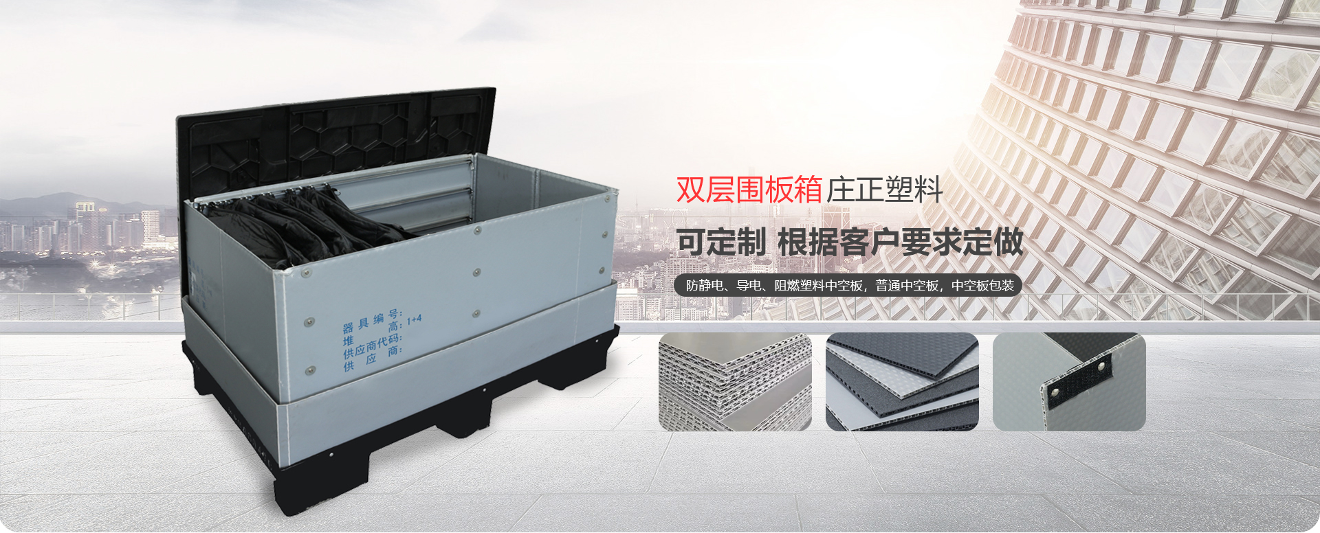 威海莊正塑料中空板有限公司是一家專注于圍板箱產(chǎn)品和中空板產(chǎn)品研究、開發(fā)、生產(chǎn)及銷售的高科技企業(yè)。我司專業(yè)生產(chǎn)銷售圍板箱、防靜電、導(dǎo)電、阻燃塑料中空板,普通中空板,中空板包裝等。是一家及研發(fā)、設(shè)計(jì)、生產(chǎn)、銷售一體化的專業(yè)制造商。產(chǎn)品具有質(zhì)輕、防潮、耐油污、抗腐蝕、無毒、無污染顏色豐富的新型環(huán)保產(chǎn)品。 主要產(chǎn)品:圍板箱、普通塑料中空板,防靜電、導(dǎo)電塑料中空板,中空板周轉(zhuǎn)箱,中空板包裝箱,中空板墊板,中空板托盤、塑料包裝制品等系列產(chǎn)品。